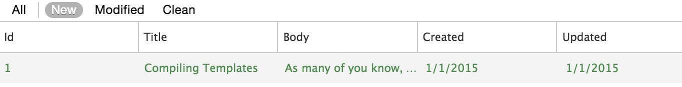 The Data tab is kept in sync with the data loaded in your application. Any record additions, deletions, or changes are reflected immediately. If you have unsaved records, they will be displayed in green by clicking on the New pill.