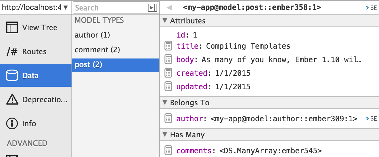 You can inspect your models by clicking on the Data tab. Check out Building a Data Custom Adapter below if you maintain your own persistence library. When you open the Data tab, you will see a list of model types defined in your application, along with the number of loaded records. The Inspector displays the loaded records when you click on a model type.