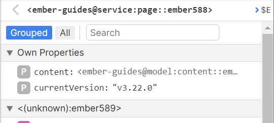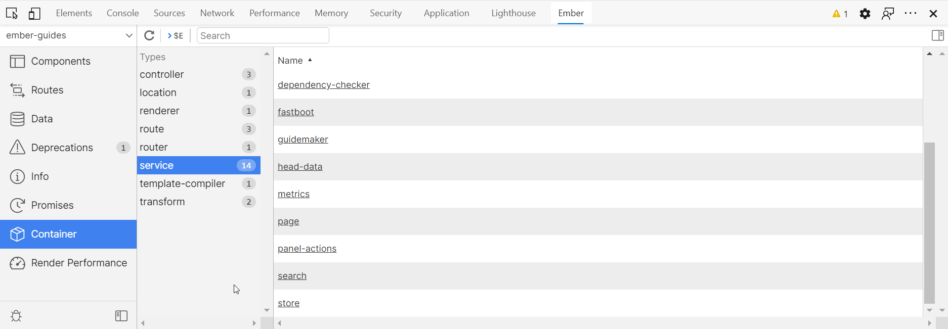 Every Ember application has a container that maintains object instances for you. You can inspect these instances using the Container tab. This is useful for objects that don't fall under a dedicated menu, such as services.