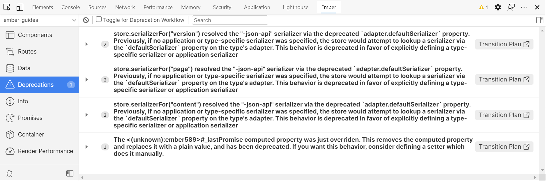 If you are using Ember CLI and have source maps enabled, you can see a list of sources for each deprecation. If you are using Chrome or Firefox, clicking on the source opens the sources panel and takes you to the code that caused the deprecation message to be displayed.